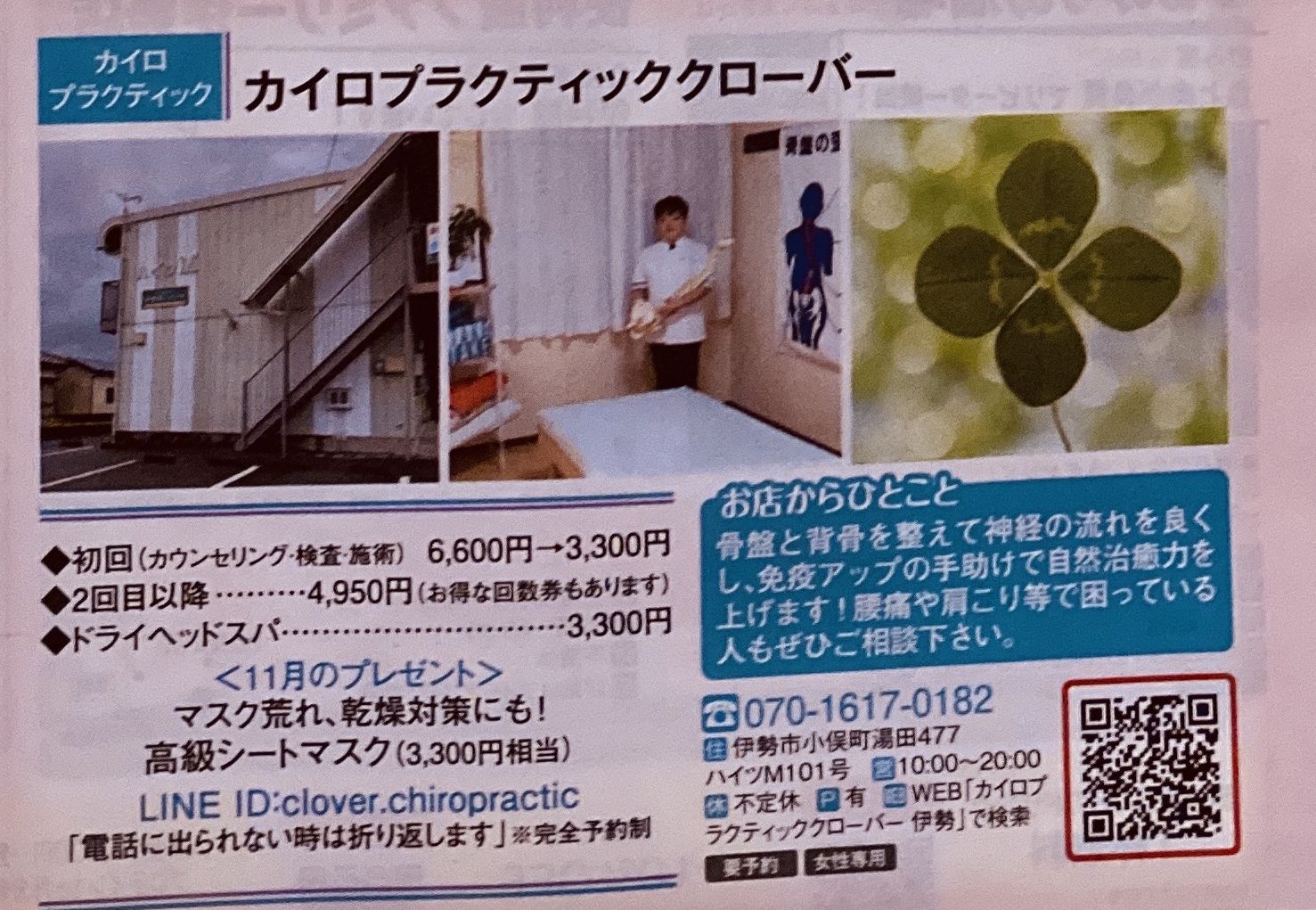 ささっての予約が取れるかはわかりませんが、カイロプラクティッククローバーは完全予約制なので 先ず、お電話かLINEでのご予約をお願いします😊