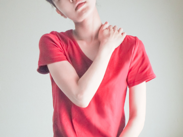 肩こりで悩んでいる50代女性。